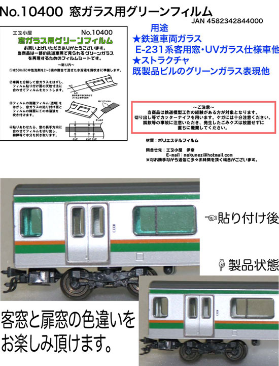 窓ガラス用グリーンフィルムです。近年の電車は窓ガラスが薄緑色になっていることがあります。