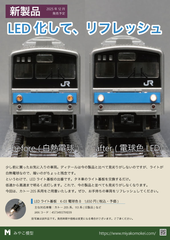「通電引通し常点灯ライト基板」のほか、「ON-OFFスイッチ付常点灯ライト基板」や「光り分けライト基板」も販売いたします。
